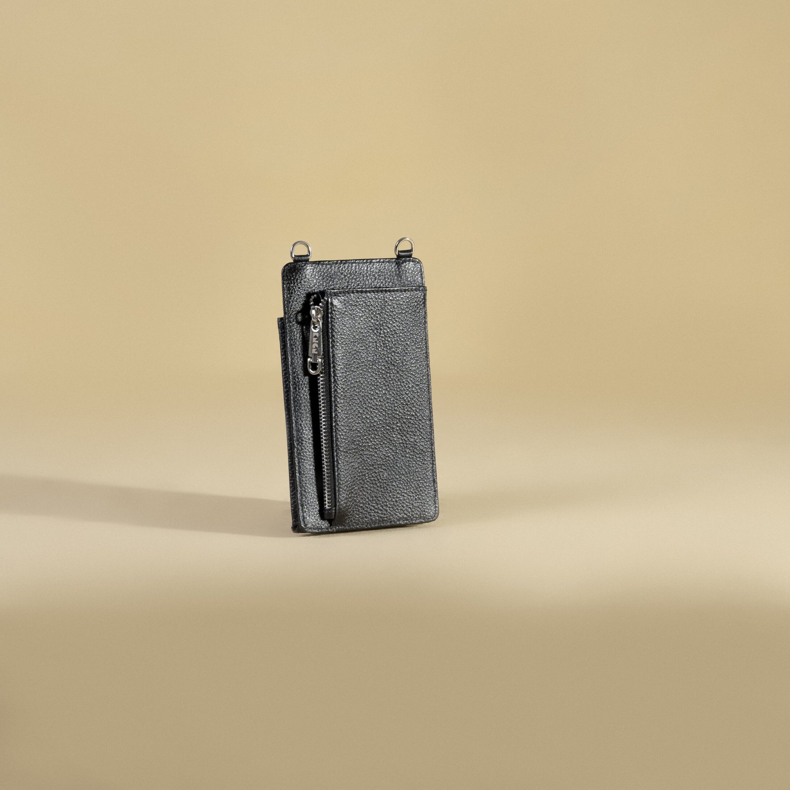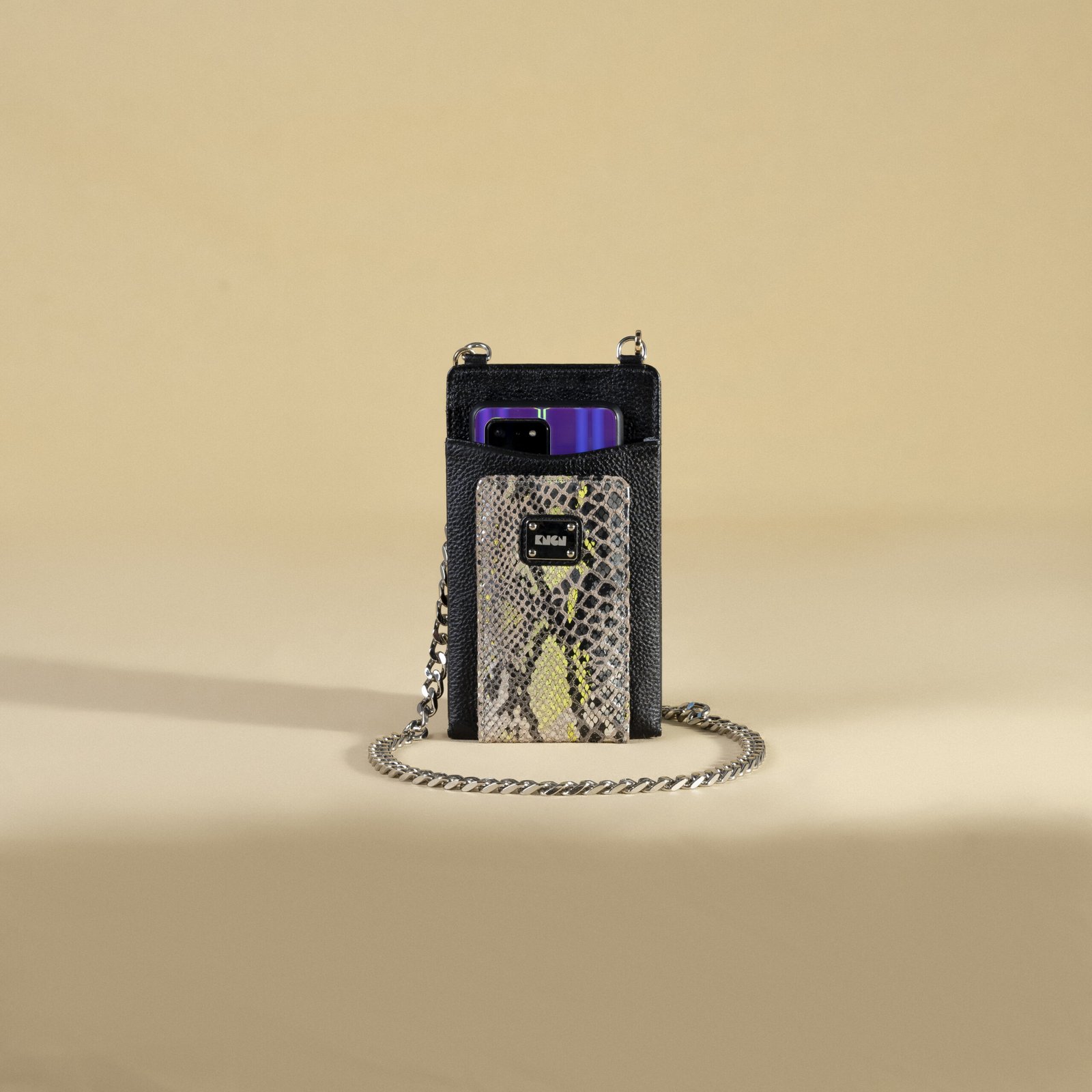 Hand crafted in genuine leather with a magnetic button opening and a zip pocket at back. The inside is lined with premium quality french suede lining. Accompanied with a crossbody chain strap.