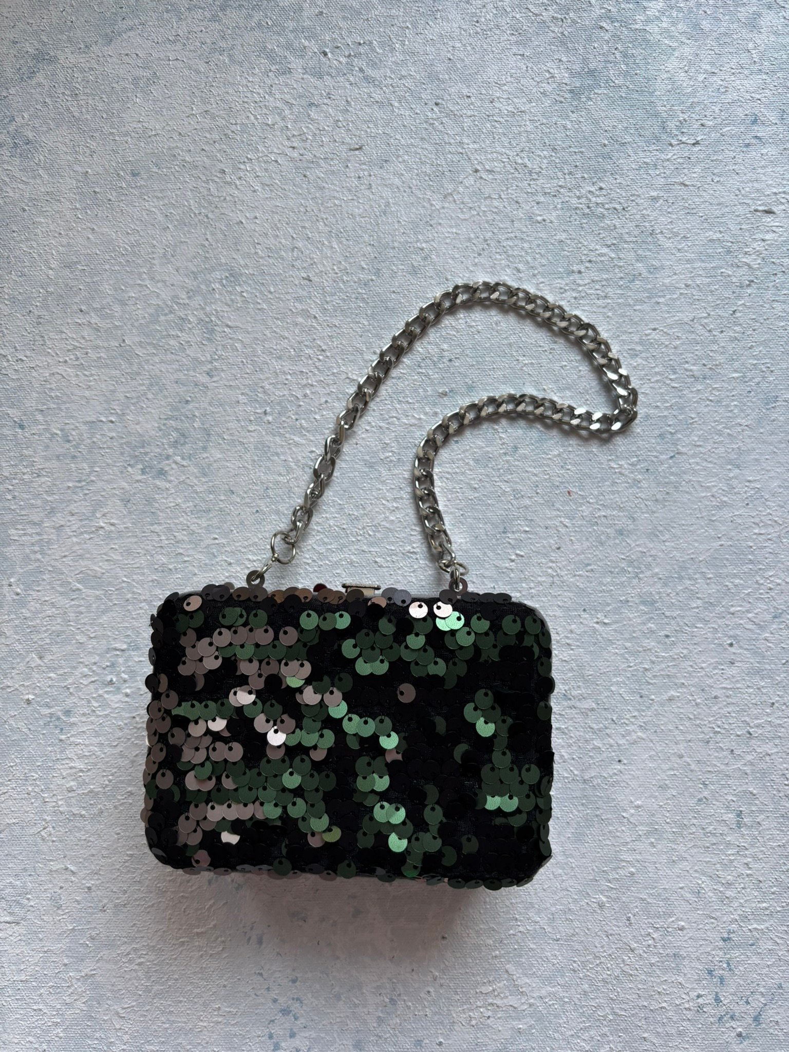 This striking version of The Gala Box Clutch features a bold, dual-tone sequin finish that perfectly captures the dramatic flair of Gilded Age evening wear.This minaudiere is handcrafted in premium sequins and velvet on a vintage frame.
