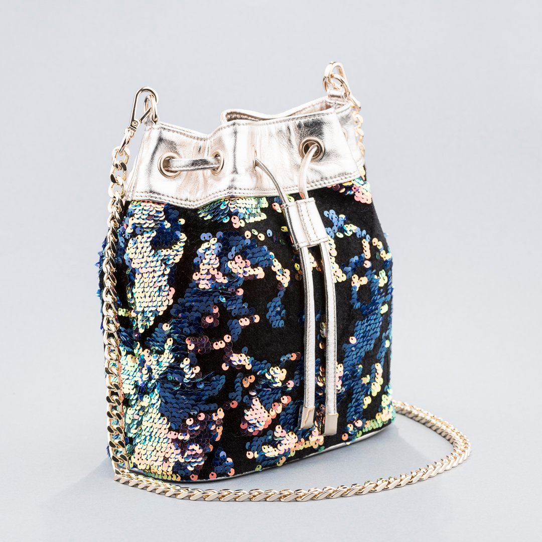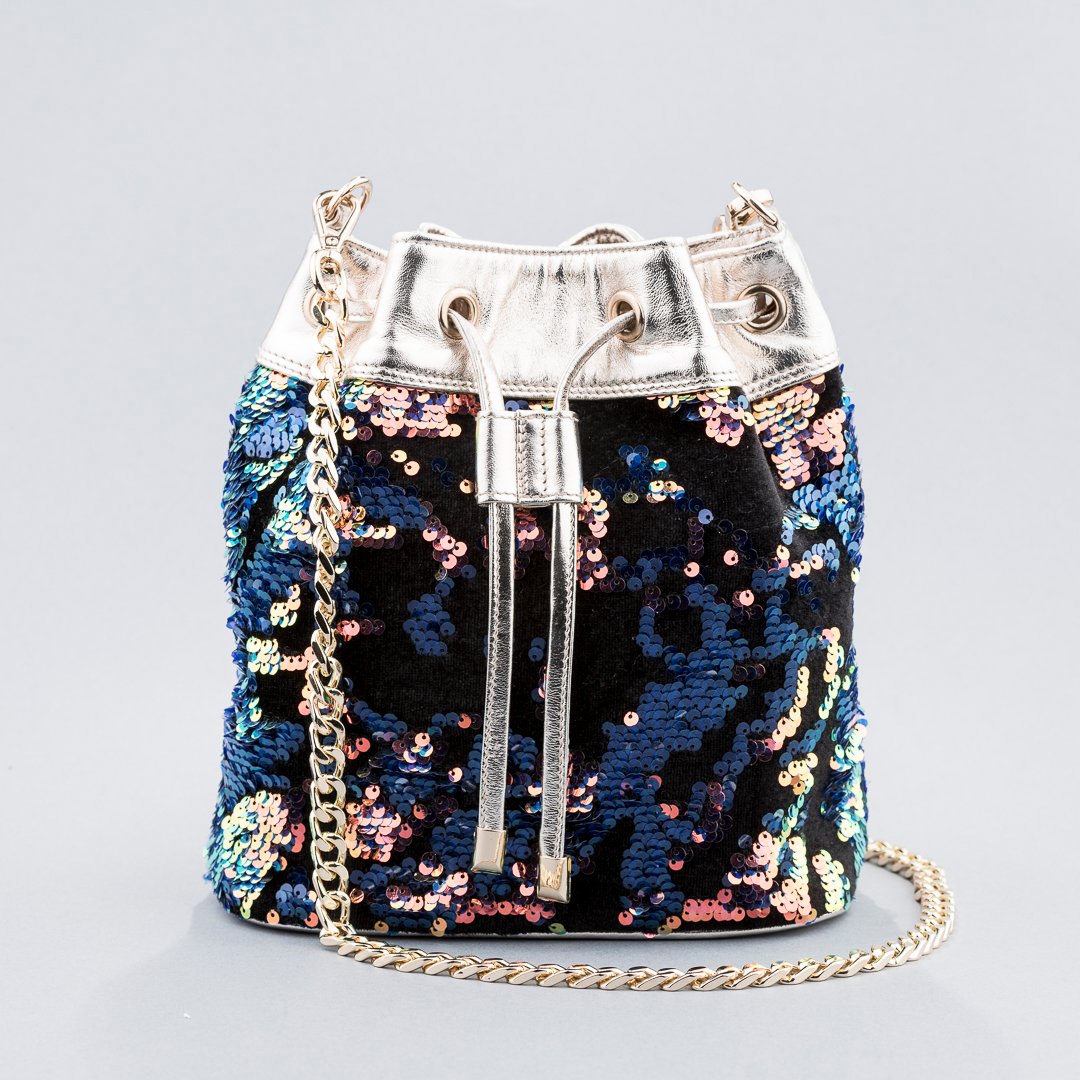 Drawstring bucket bag handcrafted in genuine leather and embroidered sequin fabric. The inside is lined with premium quality french suede fabric. Accompanied with a detachable gold metal chain strap.